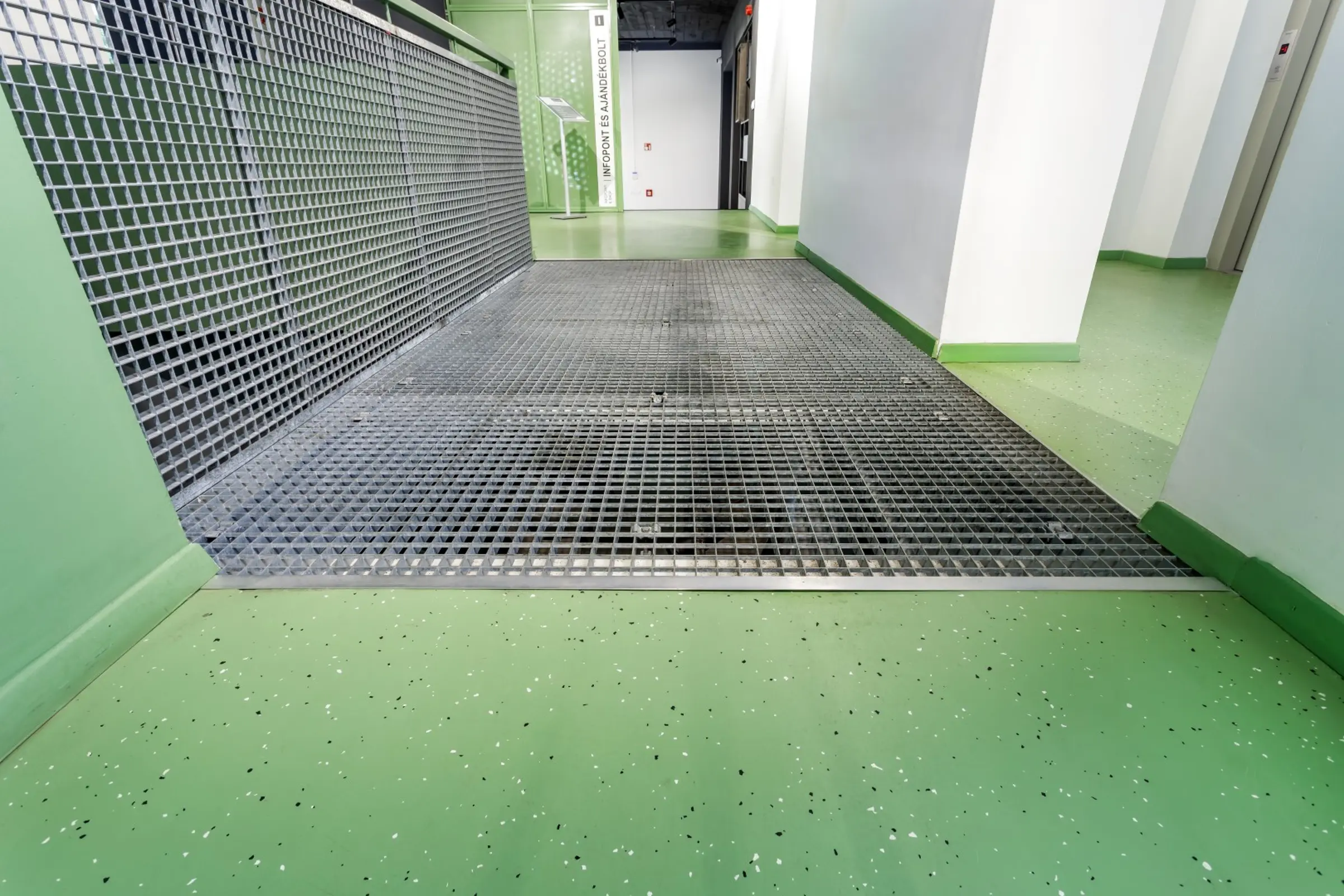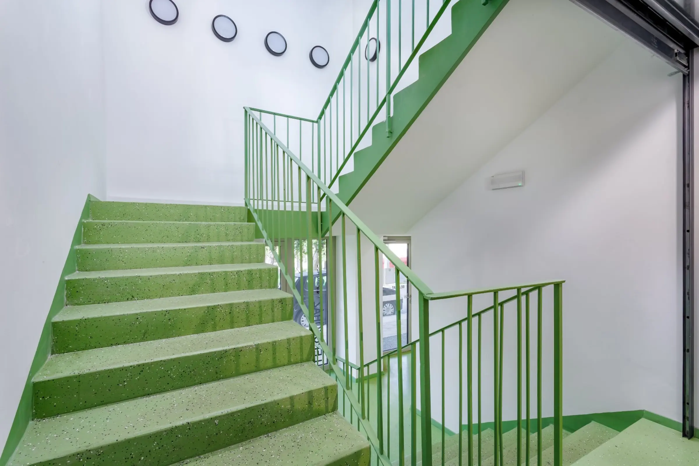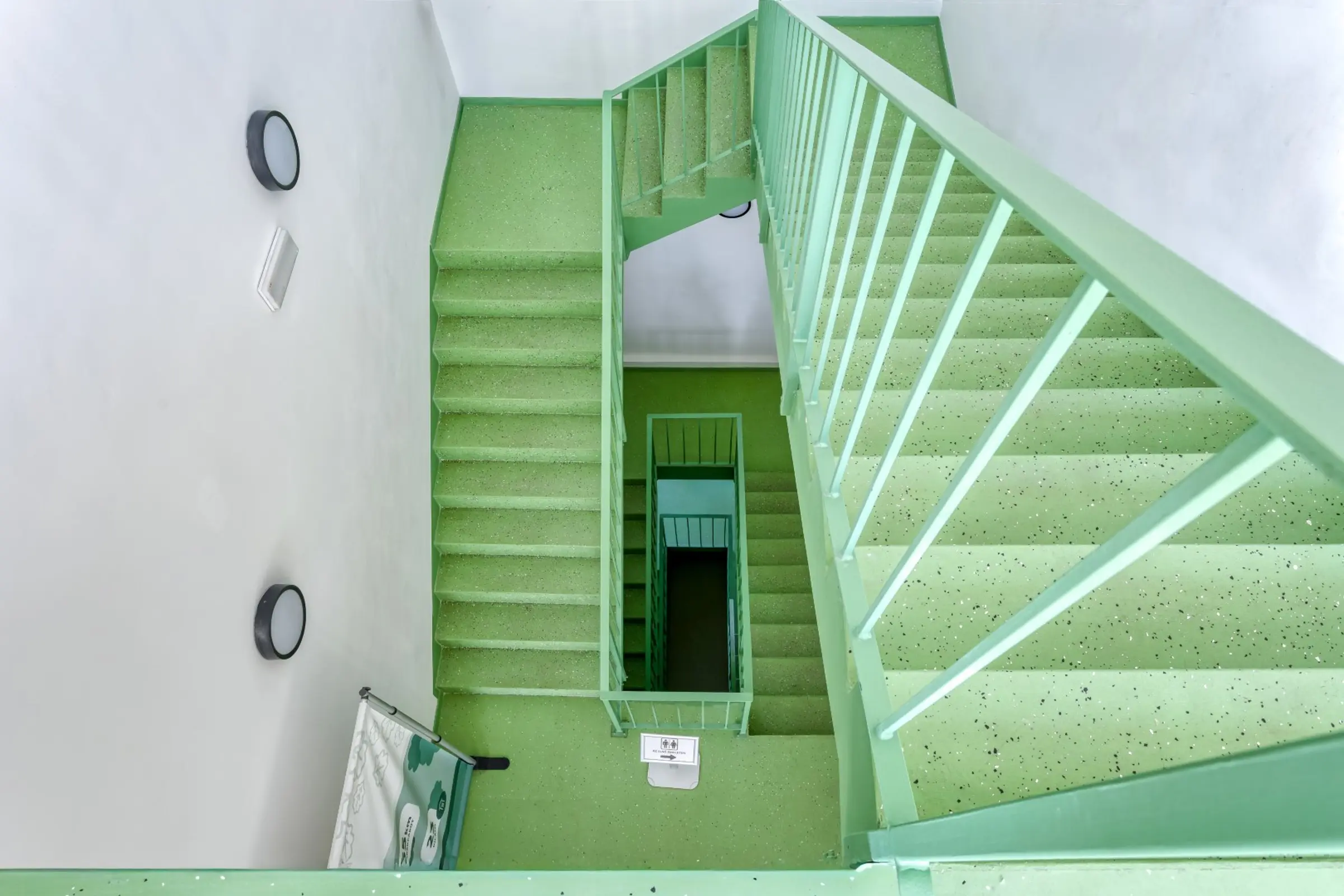 A lépcsőházban a StoFloor Industry WL 100 rendszer készült. Itt is a világoszöld árnyalat dominál, ugyanakkor a 1,5% Sto Ballotini üveggyöngy (75–150 μm) hozzáadásával a csúszásmentességi besorolás R11-re nőtt. A rendszer kiváló fényállóságú, alkalmas nedvességnek kitett felületekre is, alacsony kibocsátású*, benzil-alkohol- és nonil-fenolmentes, valamint nagy színválasztékban érhető el.