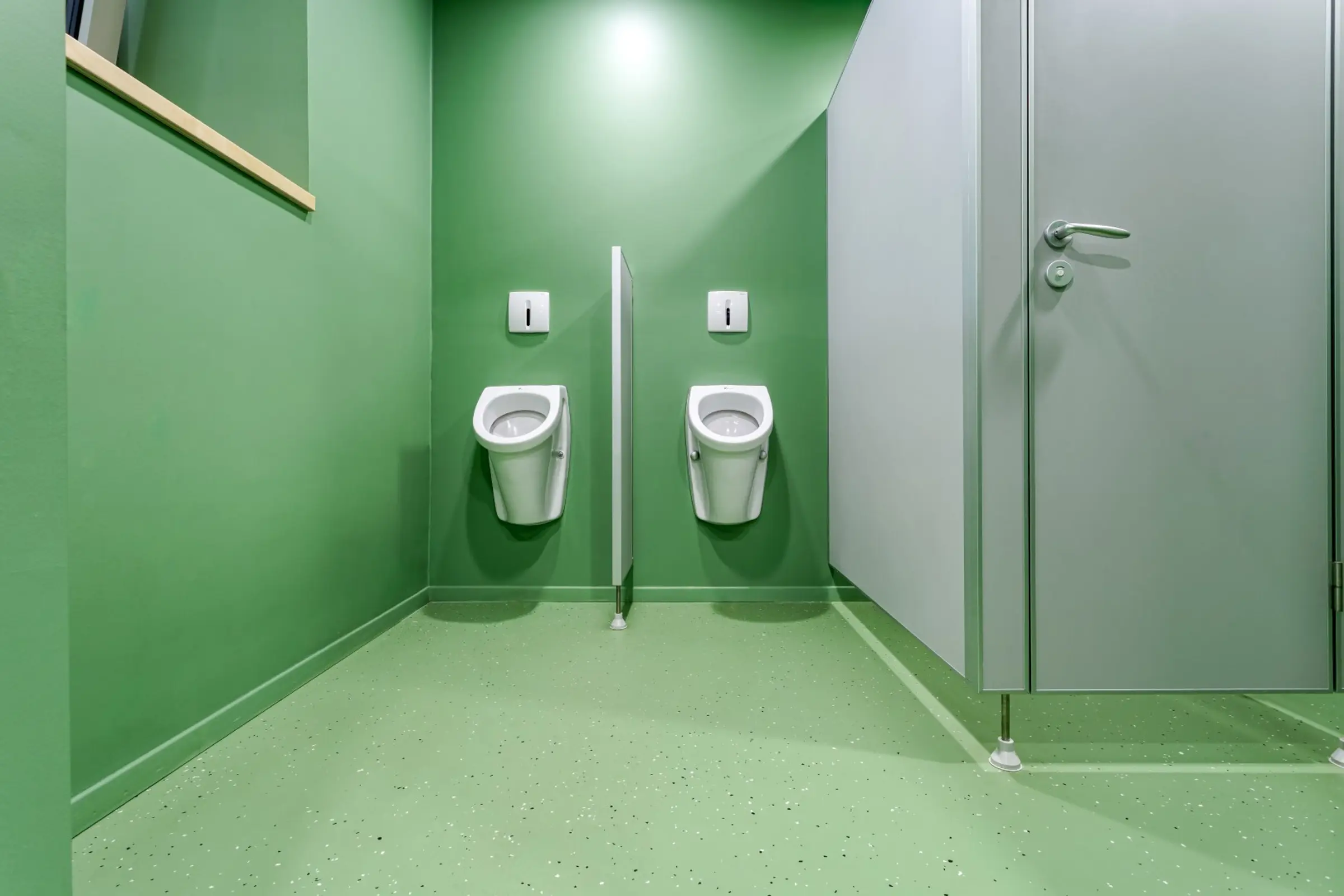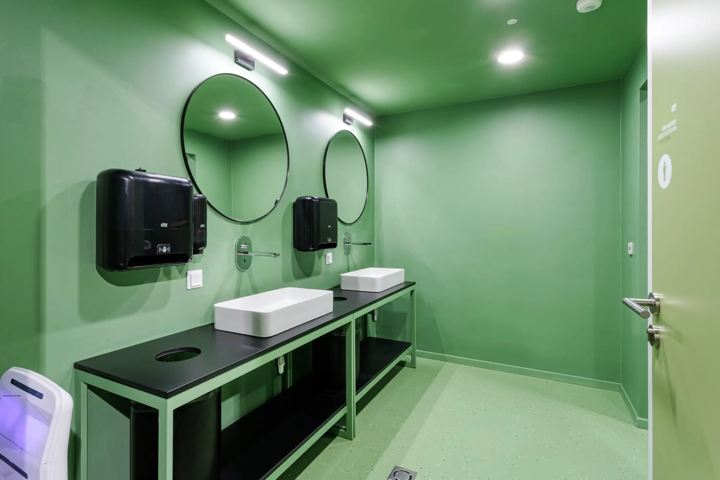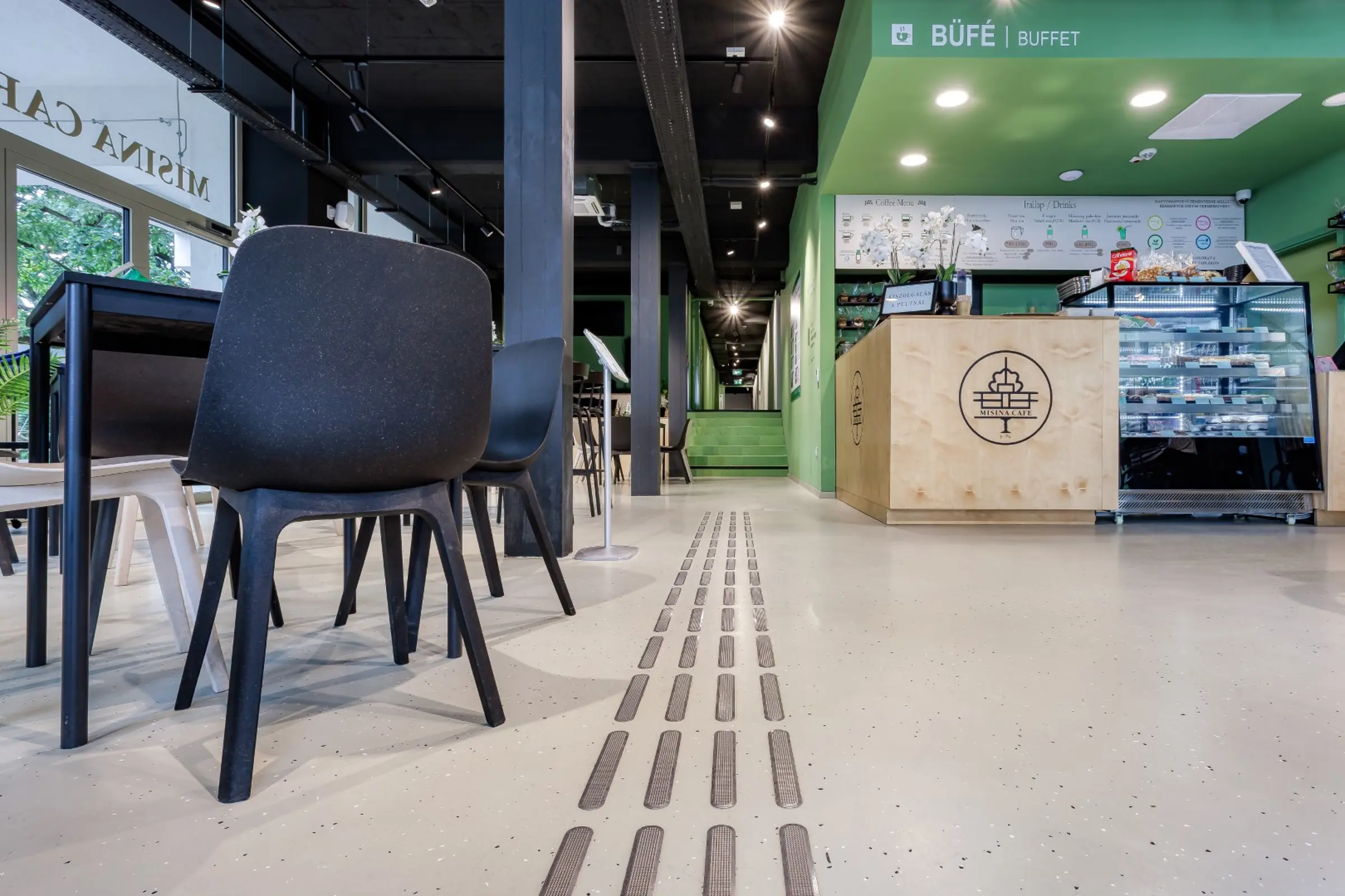 A kávézó, folyosók, öltözők és vizesblokkok padlóbevonataként a projektcsapat a StoFloor Industry BB OS mellett döntött. Ez a rendkívül robusztus, strapabíró epoxigyanta rendszer dekoratív és egyedi megjelenést biztosít. A pasztellzöld (RAL 6021) és szürke (RAL 7032) árnyalatok kombinációja, valamint a hozzáadott fekete-fehér, 3 mm-es StoChips esztétikus, barátságos és természetközeli megjelenést teremt, amely illeszkedik az épület új funkciójához. A bevonat R9 csúszásmentességi osztályt is biztosít.